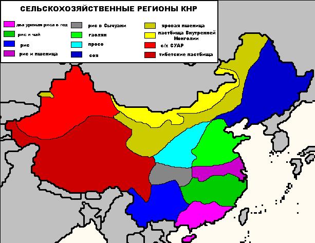Традиционно пшеница являлась основой питания на севере Китая, этим объясняется обилие мучных изделий в здешней кухне. Из пшеничной муки готовят булочки (慢头), блины (饼), лапшу (面条), пирожки с начинкой - баоцзы (包子), пельмени (饺子), суп с ушками (馄钝) или вонтон и т.п. На юге Китая основу питания составляет рис. Помимо самого риса здесь употребляют в пищу тонкую и толстую лапшу из рисовой муки (米线, 米粉), рисовые пирожки (米糕), шарики из клейкого риса в супе (汤圆) и др.В письменных источниках до династии Цинь (221 г. до н.э.) наиболее часто упоминаются такие фрукты как персики, сливы и финики (ююба), за ними следуют груши, сливы, абрикосы, хурма, дыня, боярышник и тутовые ягоды, наиболее редко встречаются дереза, китайка и вишня. Большинство этих растений происходит из умеренной зоны северного Китая или являются завезенными в Китай еще в доисторические времена. Персики, сливы и каштаны часто использовали в ритуальных церемониях. Из северо-западного Китая через Центральную Азию в I-II веке до н.э. персики были завезены в Персию; и уже оттуда распространились в Грецию, затем в другие европейские страны. Это расходится с общепринятым представлением о том, что Персия является родиной персиков. Другие китайские фрукты― мандарины, помело, апельсины, личжи (личи) постепенно распространились по всему миру.