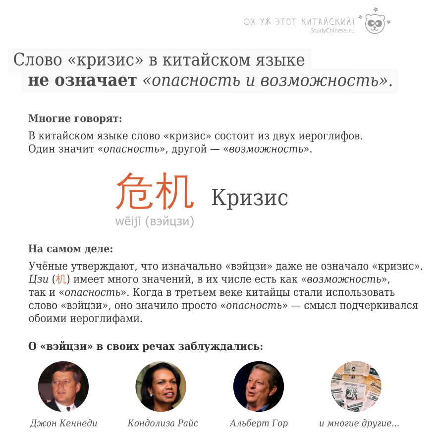 Подробнее о происхождении данного заблуждения можно прочитать в статье «Слово кризис в китайском языке». Или просто кликнуть картинку.