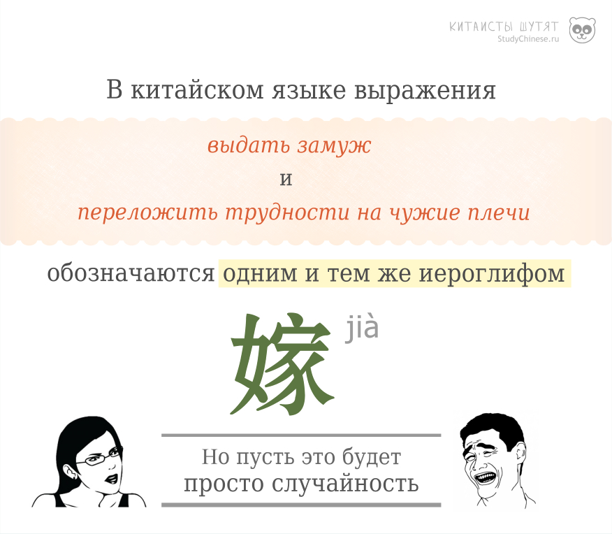 Просто небольшое совпадение, о котором говорят словари: иероглиф 嫁 переводится не только как «выходить/отдавать замуж», он также имеет значение «сваливать свои проблемы на плечи других». Не знаем к чему вели китайцы, но справедливости ради стоит отметить, что для образования последнего словосочетания необходимо присоединить слово 祸 huò – беды, трудности: 嫁祸于人 – переложить трудности на чужие плечи.