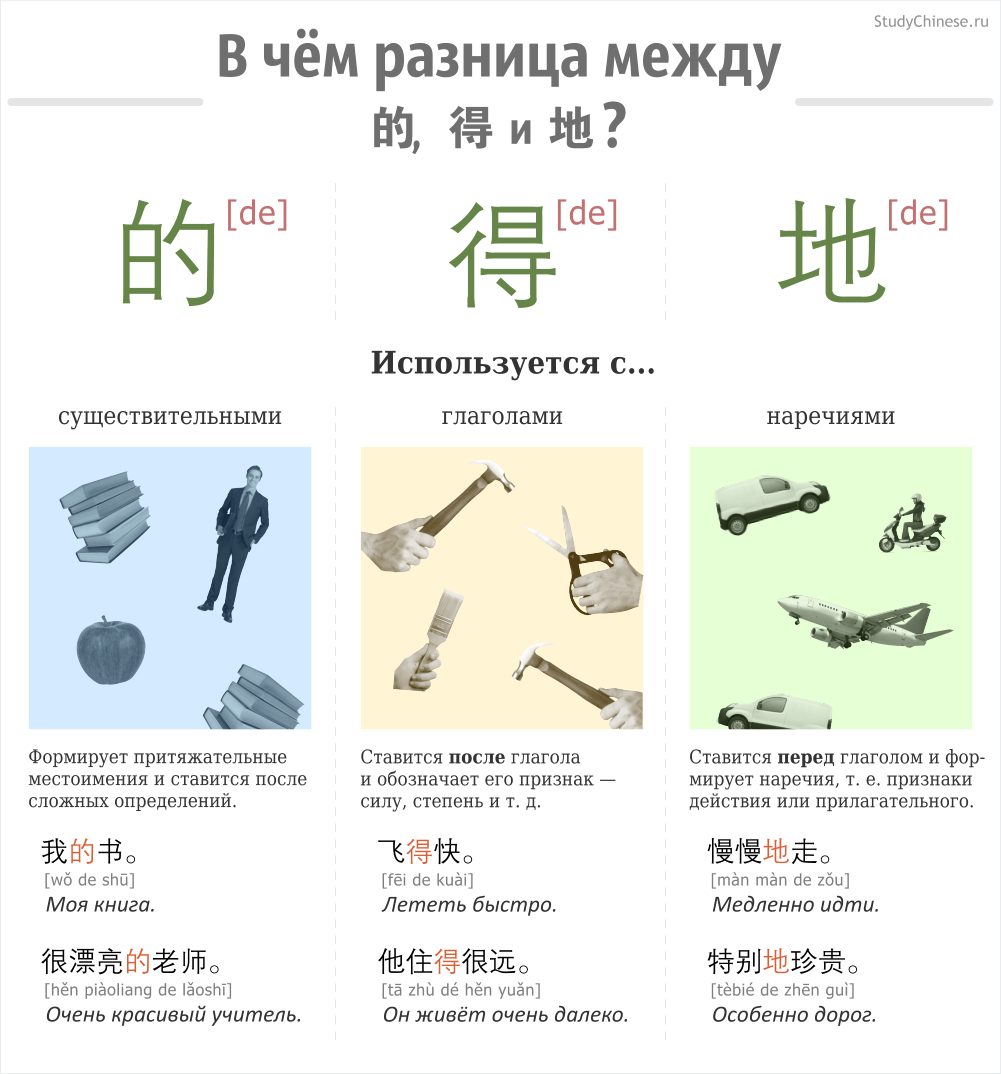 Ох уж эти частицы — вроде бы мелочь, а путаницу вызывают регулярно. На этот раз мы говорим о трех весёлых иероглифах 的, 得 и 地. Несмотря на одинаковое звучание — de — используются они для совершенно разных целей, неясных для многих начинающих (и не только) китаистов. Немного подробнее об этой и других темах написано в статье, здесь же мы предлагаем вашему вниманию квинтэссенцию — а именно — небольшую картинку, изображающую способы использования данных частиц. Надеемся, она поможет вам привести разрозненные сведения в порядок, а если они уже в порядке, то заставит задуматься, как же графически можно изобразить наречия... :)