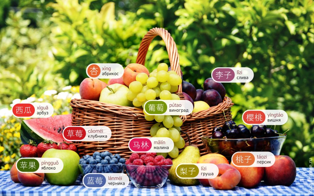 С тех пор, как мы последний раз смотрели на мир глазами китайца прошла зима, отцвели сады, и вот, уже начали появляться первые ягоды. Однако в средней полосе процесс созревания настолько долог, что мы решили выложить всё и сразу: целый натюрморт с арбузом, персиками и десятком китайских иероглифов! Вполне вероятно, что вы видели некоторые из них на коробках с фруктами, привезёнными из Китая. Теперь они и на самих фруктах для пущей наглядности! Так что, если вы всё ещё не знаете, как по-китайски называются вишни, яблоки или виноград — просто взгляните на картинку ниже, и всё встанет на свои места! Эти несложные слова помогут вам в дальнейшем, если уж не торговаться на базарах Поднебесной, то читать китайские тексты — точно!