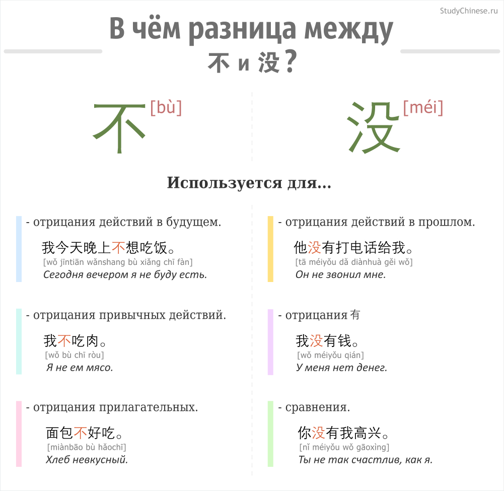Сегодня мы рады представить вам небольшую шпаргалку по использованию отрицаний 不 bù и 没 méi, сделанную по мотивам соответствующей статьи в разделе «Грамматика». Научиться использовать данные слова очень просто, достаточно лишь выделить несколько нехитрых отличий, которые позволяют придавать отрицательному предложению разный смысл. Кроме того, следует запомнить, что такие глаголы, как 是 shì, 在 zài, 知道 zhīdào, 认识 rènshí, а также некоторые другие ментальные глаголы всегда употребляются с 不. Всё остальное кратко отображено на картинке ниже.